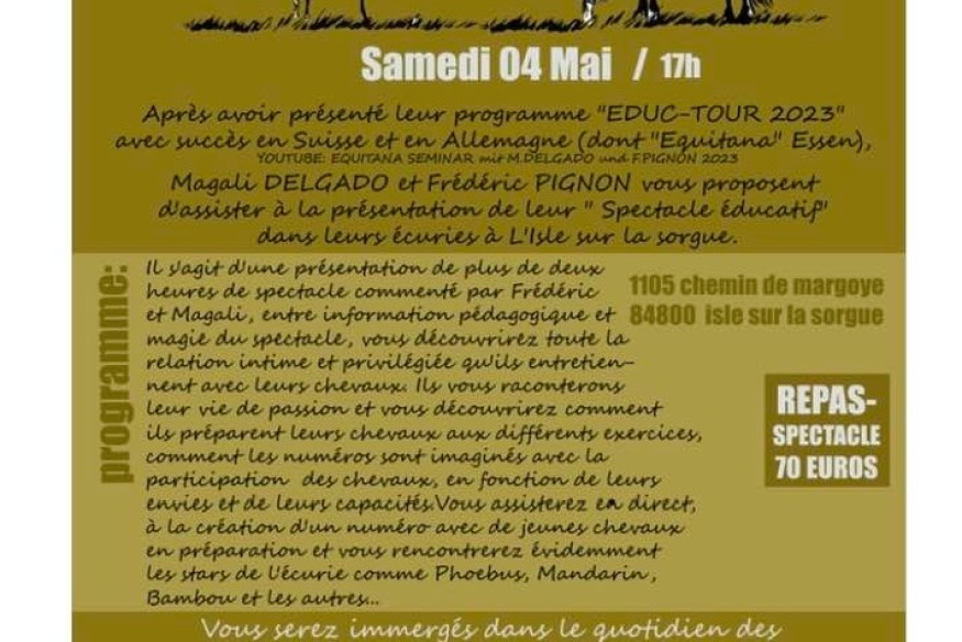 Après avoir présenté leur programme Eductour 2023 avec succè-s en Suisse et en Allemagne, Magali et Frederic vpus proposent d'assister à leur "spectacle éducatif" dans leur écurie à l'Isle sur la Sorgue le 4 Mai