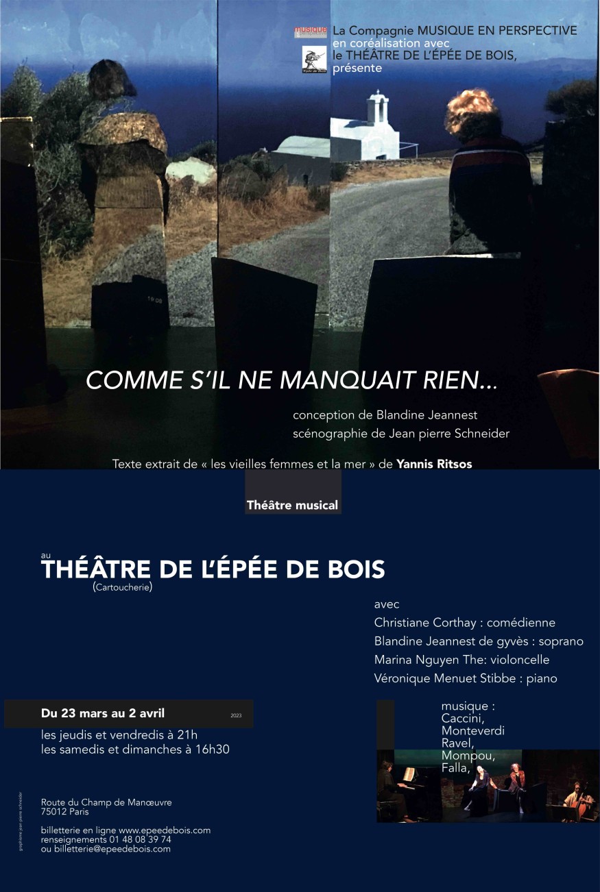 Comme s’il ne manquait rien, théâtre musical, est un spectacle composé d’extraits de la pièce de Yannis Ritsos les veilles femmes et la mer (1959) traduction Bruno Roy, éditions Fata Morgana.