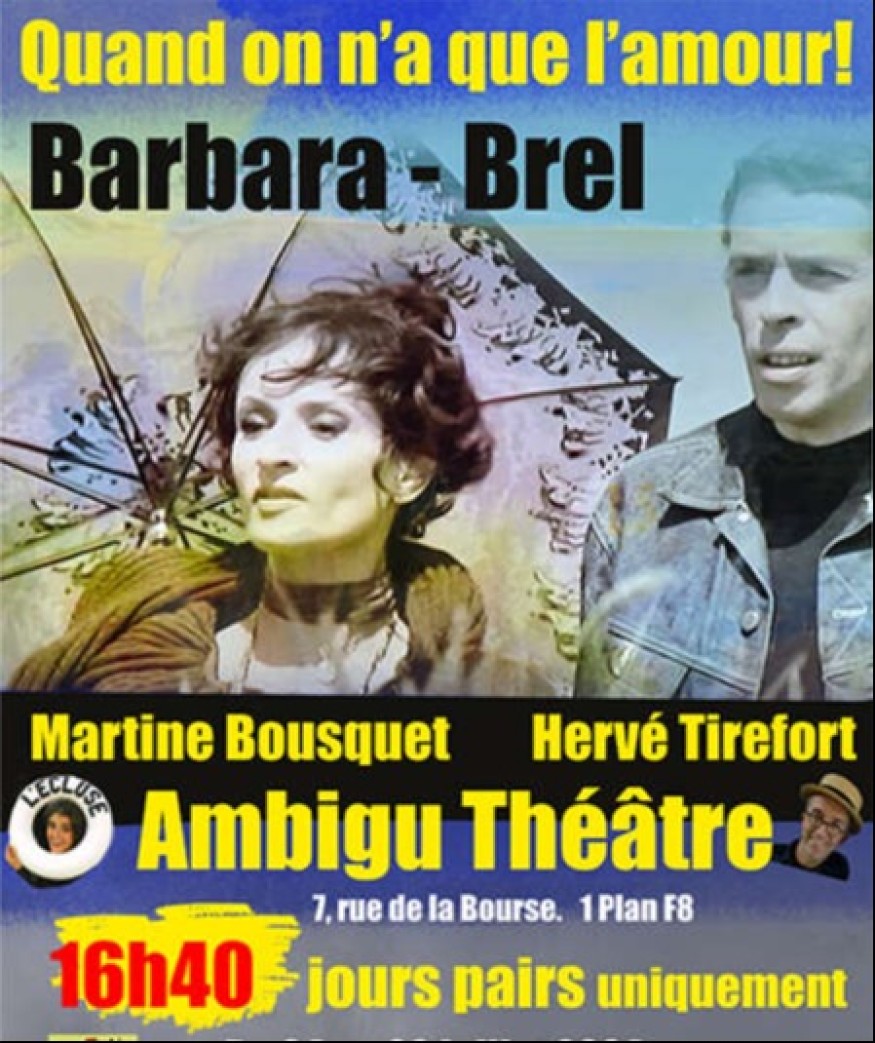 Le duo tricote, comme une ultime rencontre, les univers de Brel et Barbara : leur quête d’absolu, leur vision du monde nourrie tout à la fois des blessures de l’enfance et de leur « sacré goût de vivre » !